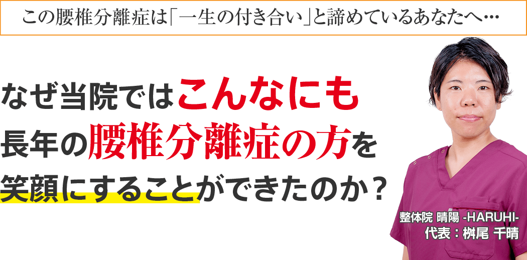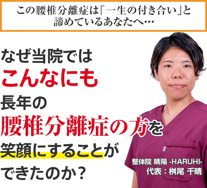 もしあなたが今、上記のようなお悩みがあり、ほんの少しでも心のどこかで良くなりたい!と思われているなら、整体院 晴陽-HARUHI-に来院し、そのつらい腰椎分離症を根本から改善しませんか?私が必ず、あなたの力になってみせます。