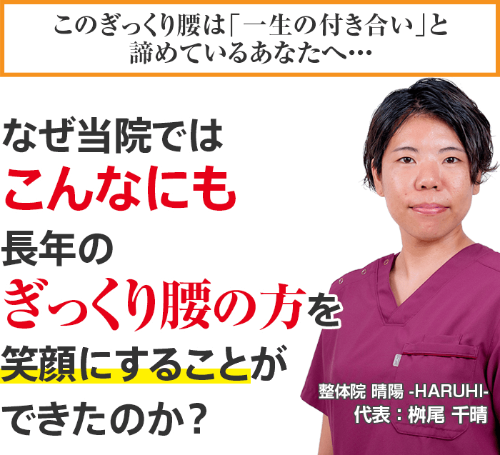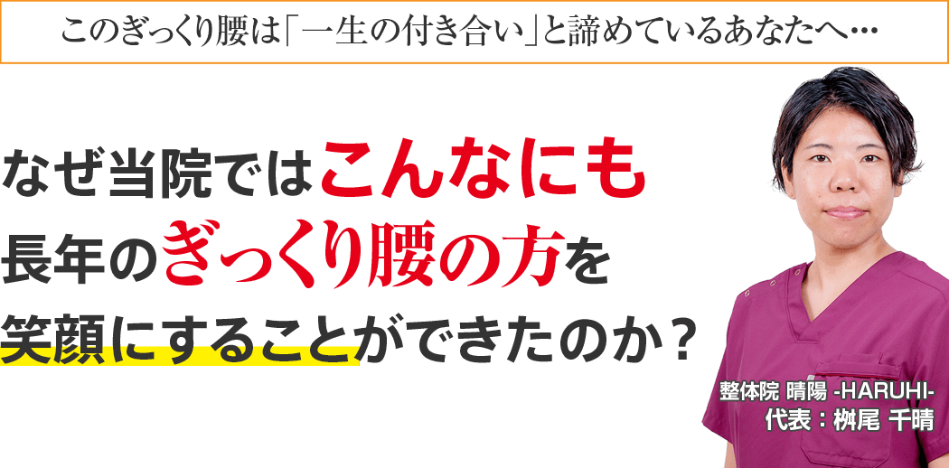 もしあなたが今、上記のようなお悩みがあり、ほんの少しでも心のどこかで良くなりたい!と思われているなら、整体院 晴陽-HARUHI-に来院し、そのつらいぎっくり腰を根本から改善しませんか?私が必ず、あなたの力になってみせます。